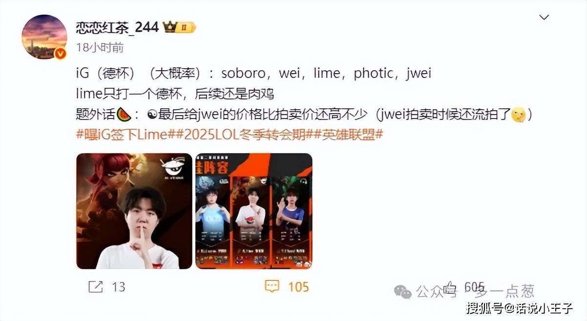 有知情人透露IG这次徳杯中单是Lime,是EDG的青训中单选手。此前IG就一直积极在和这名选手谈判,现在应该是谈下来了。另外一名知情人就直接透露了此次IG德杯的阵容,上单Soboro,打野Wei,中路Lime,下路Photic,辅助Jwei。这个阵容等于说IG是进行了大换血,4个人都换了,也只保留了Wei。Wei在这个阵容中毫无疑问他就是院长,能否带得动都是一个很大的问题。