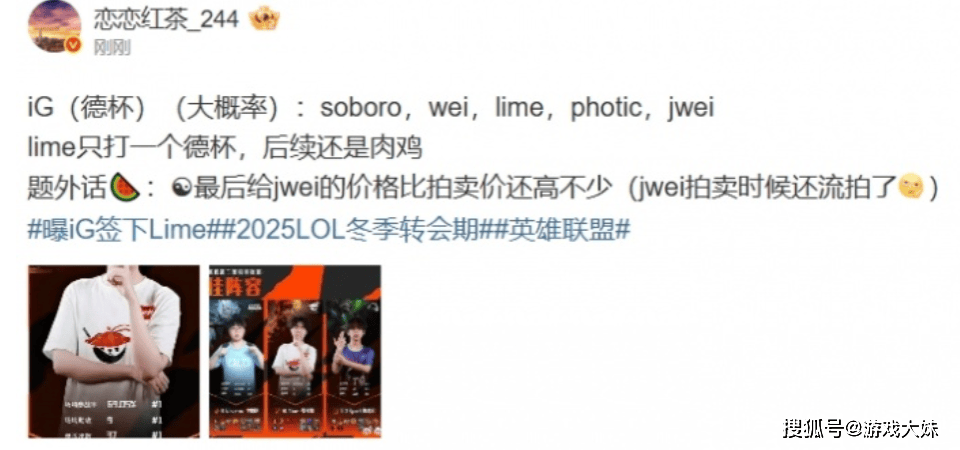 IG德杯阵容被曝光,theshy和rookie都不在,新赛季真不打了?近日,爆料人“恋恋红茶”再度掀起LPL转会期讨论热潮——他公布了iG新赛季阵容:soboro、wei、lime、photic、jwei,这份名单一出,外界立刻开始分析新阵容的打法与潜力,然而最令人关注的并不是名单里的这五位,而是名单之外那位未出现的人——TheShy。