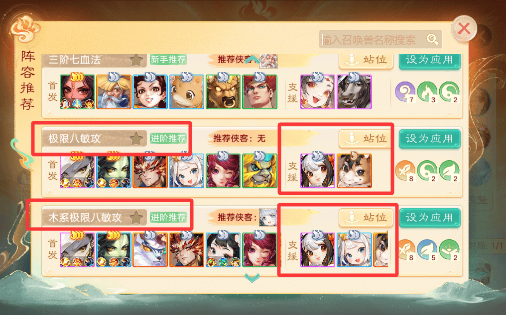 站位方面,大家把血宠黄金兽安排在前排抗伤,第二排输出放在两侧,支援1星宝宝站在支援区即可,大家也可以在阵容推荐里面,继续去研究一下6敏攻、7敏攻、8敏攻可以怎么搭配召唤兽宝宝,比如极限八敏攻、木系极限八敏攻、木系敏攻流等等流派,大话做了非常贴心的新手阵容推荐引导。