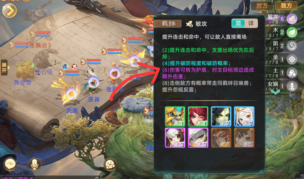 6敏攻羁绊的效果是,伤害可转化为护盾,对主目标周边造成额外伤害,2敏攻提升连击和命中,4敏攻提升破防程度和破防效率。