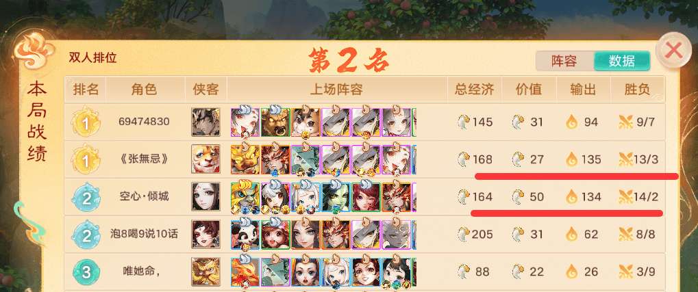 整套阵容玩下来的数据,我的总经济、输出、胜负场数,都不比第一名差,我们第二名敏攻对阵他们第一名敏法流,并不会落下风,如果单挑一对一,绝对不会输的,天梯赛队友随机因素太大了,而且也没有及时支援给到我需要的召唤兽和内丹。