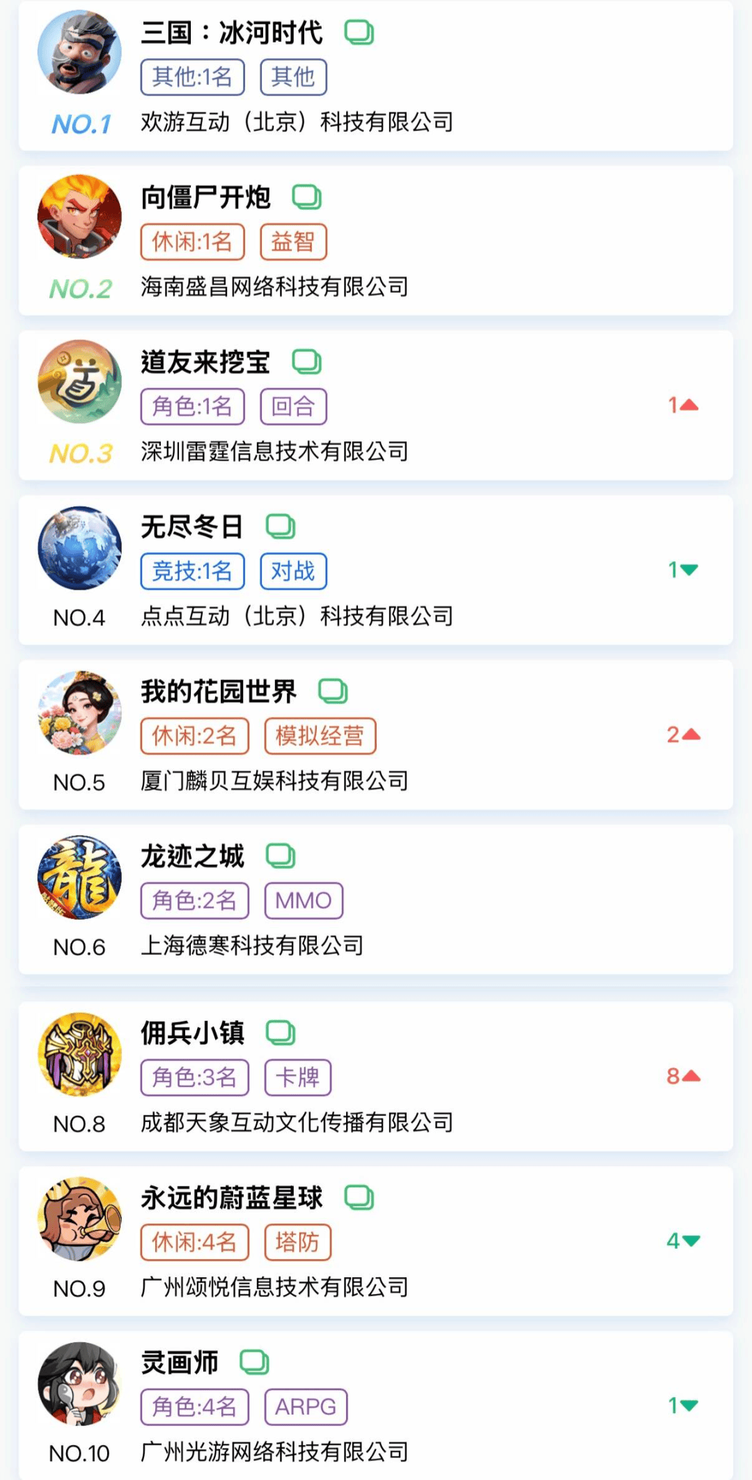 《无尽冬日》首次掉出前三,《神器传说》《佣兵小镇》重入前10