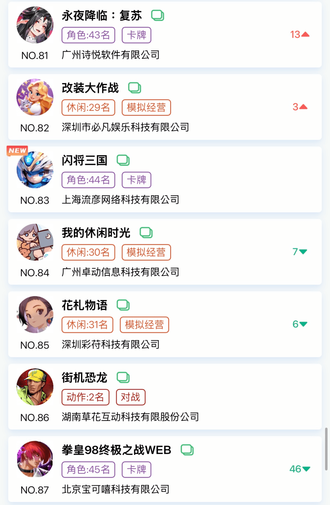 这款由芒果互娱授权综艺IP的小游戏相比上一期排名大幅前进了30名,主打二合的模拟经营玩法已经非常成熟,配合 IP本身号召力,对玩家有一定的吸引力。