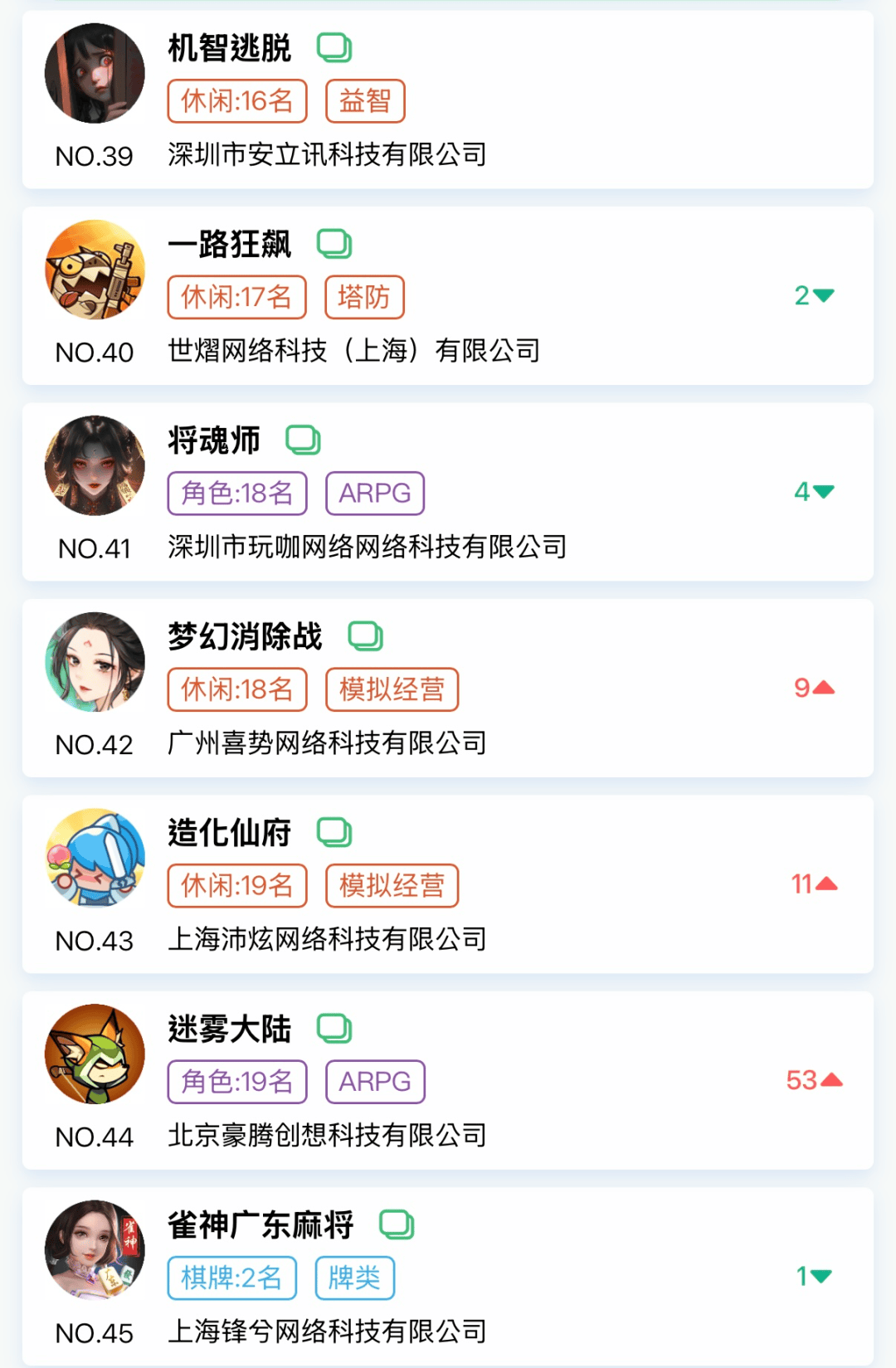 此外,豪腾旗下去年曾经火过一阵的刷子游戏《迷雾大陆》本期排名大幅跃进了53名,位列44名,豪腾创想目前有三款游戏在本期榜单中。
