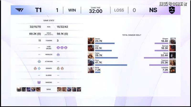 结果第一局比赛,T1打成了单方面的碾压局。前期双方打得比较谨慎,比赛第19分钟左右,Scout发条拉四个,NS激战打出2换4打退T1;比赛第22分钟左右,两队爆发厄塔汗团,T1打出2换5团灭NS后迅速拉开经济差;比赛第27分钟左右,T1拿下大龙回身打出0换3大胜;最终比赛第32分钟整,T1打出1换5后结束比赛。