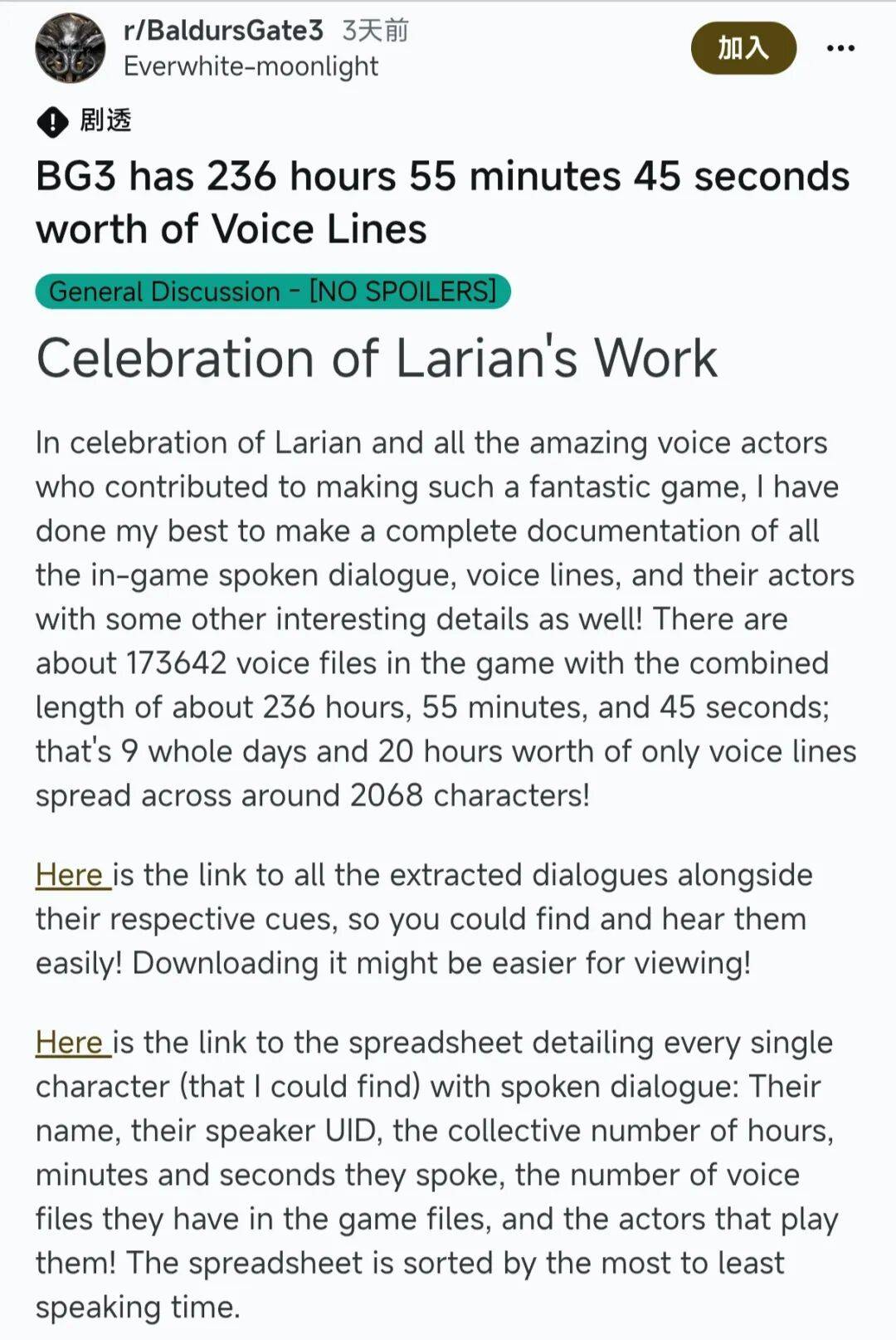 最近,甚至有网友细心统计了《博德之门3》里面的语音到底有多长,简直是堪称恐怖的厨力……
