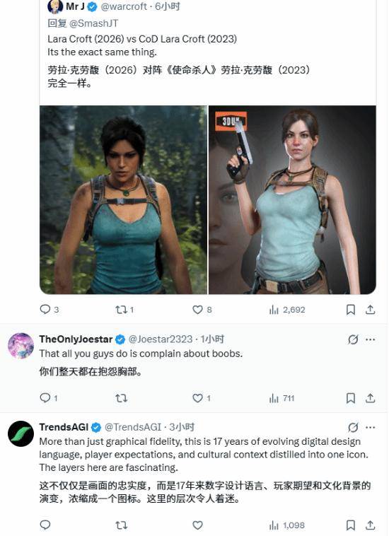 确实有人是喜欢看身材好的角色,但对于《古墓丽影》这款游戏,能走到今天,早就不只是“胸有多大”的问题了,只是身材是最容易拿出来吵的“表层符号”。