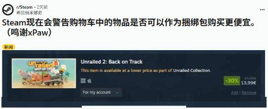 据 ShiraNamiNani 分享,当玩家将某款游戏加入购物车时,如果存在通过捆绑包或合集以更低价格购买的情况,Steam 会主动发出提醒。例如,该玩家在购买《一起开火车 2:重返轨道》时,该游戏单独售价为 13.99 美元(7 折)。然而,包含该游戏及其前作的“《一起开火车》合集捆绑包”折扣力度更大,仅为 5.8 折,售价 13.58 美元。通过 Steam 的提醒,玩家不仅能够节省 0.41 美元,还能额外获得前作游戏。