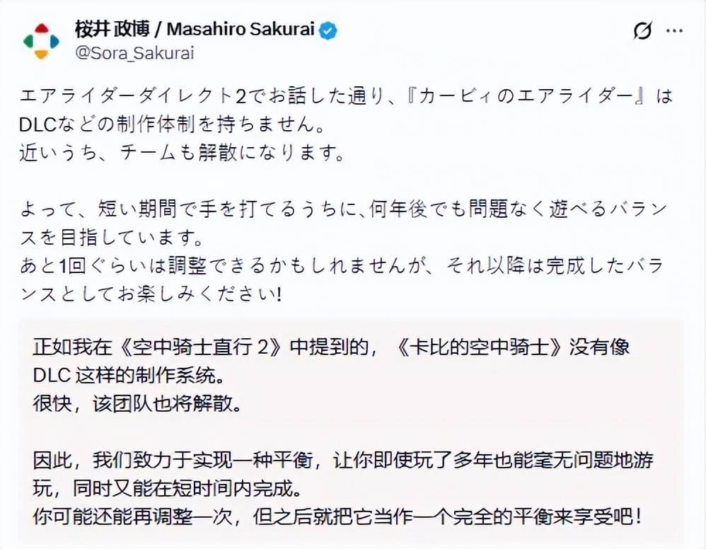 制作人樱井政博紧接着发文称,《星之卡比:飞天骑士》没有DLC计划,开发团队近期会解散。
