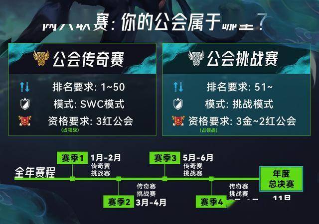 比赛模式上,公会传奇联赛将采用SWC模式,公会挑战联赛则使用挑战模式。全年赛事共设四个赛季及一次年度总决赛,每个赛季由8支公会参与,采用淘汰制进行。每赛季的冠亚军公会将直接晋级年度总决赛,其余被淘汰的公会需重新申请下一赛季席位。
