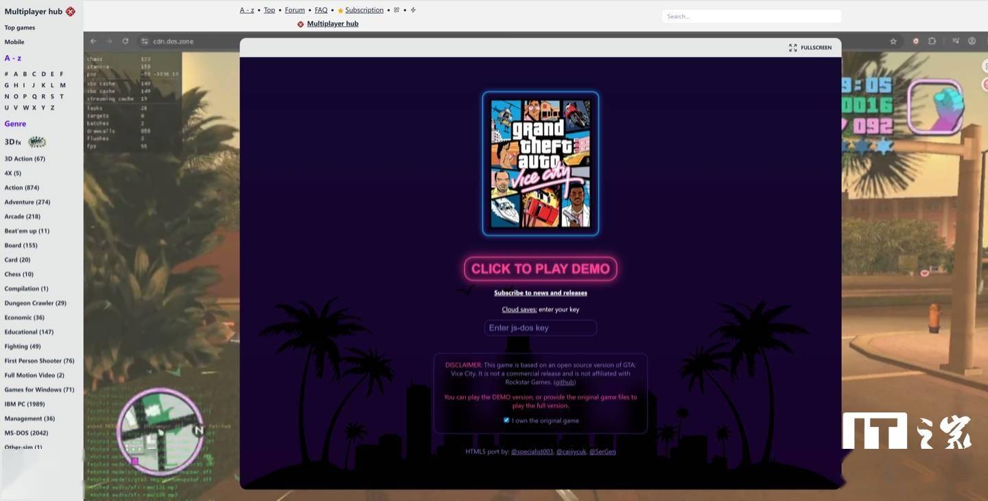 IT之家 12 月 19 日消息,据科技媒体 NoteBook Check 今天报道,最近有高手在 DOS Zone 平台发布了 HTML5 版本的《GTA:罪恶都市》,可使用触屏、键鼠、手柄进行游玩(游玩网页链接:https://dos.zone/grand-theft-auto-vice-city/)。