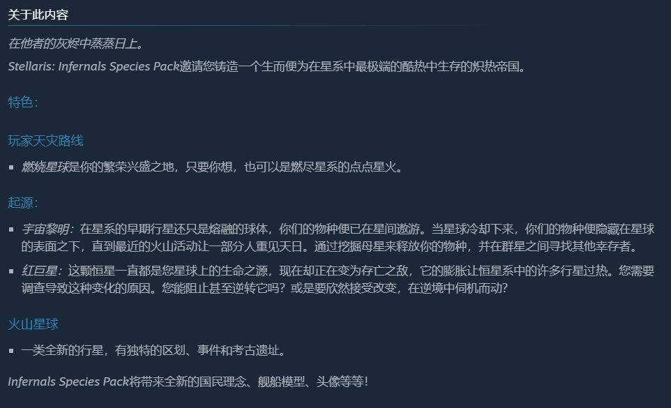 炼狱物种包相比以往的物种包进一步提升了标准,引入了新的星球类型以及星系热症玩家危机路线。