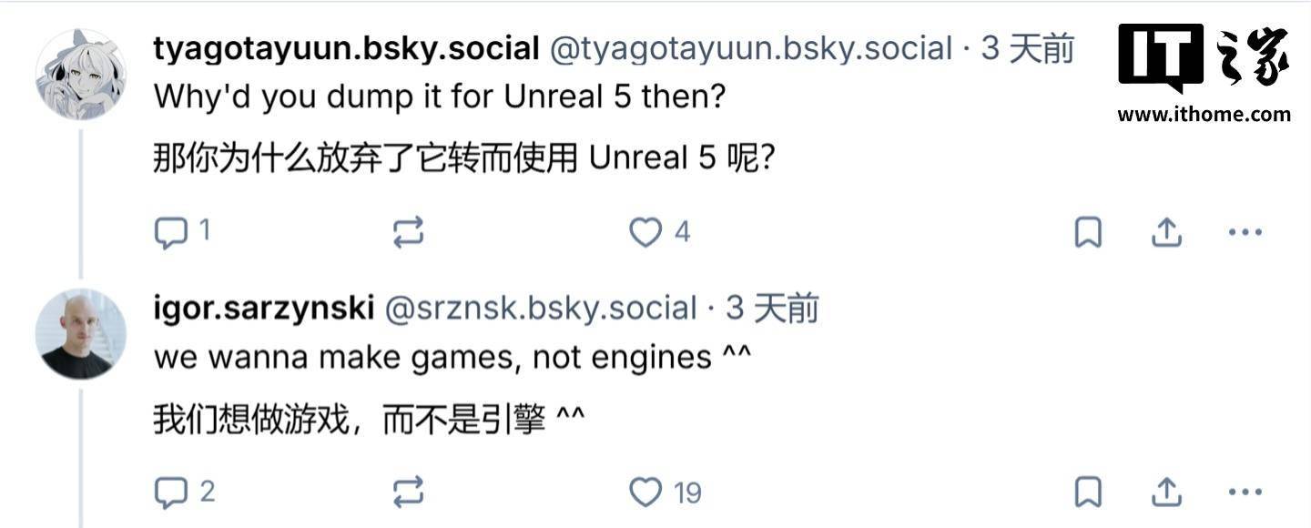 尽管如此,这名开发者依然为《赛博朋克 2》转向虚幻引擎 5(IT之家注:UE5)的决定进行辩护。他表示:“我们想做的是游戏,不是引擎”。这番话可能是在暗指开发、维护一款自研引擎需要耗费大量时间和资源,而这些时间和金钱本可以更高效地利用于制作游戏。